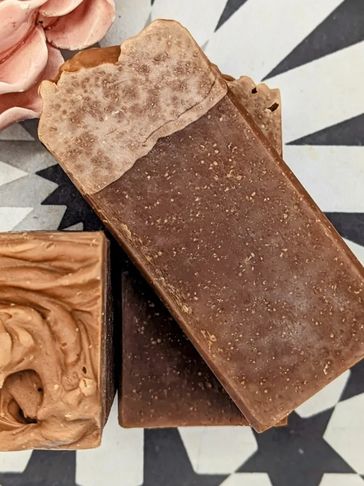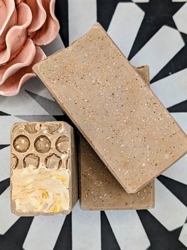 RSPO Palm Oil*, Coconut Oil*, Sunflower Oil*, Cocoa Butter*, Castor Oil*, Oat Milk*, Lye, Colloidal Oats*, Kaolin Clay, Honey*, Sea Salt, Titanium Dioxide, Himalayan Rubarb, Gold Mica, Fragrance Oil Blend